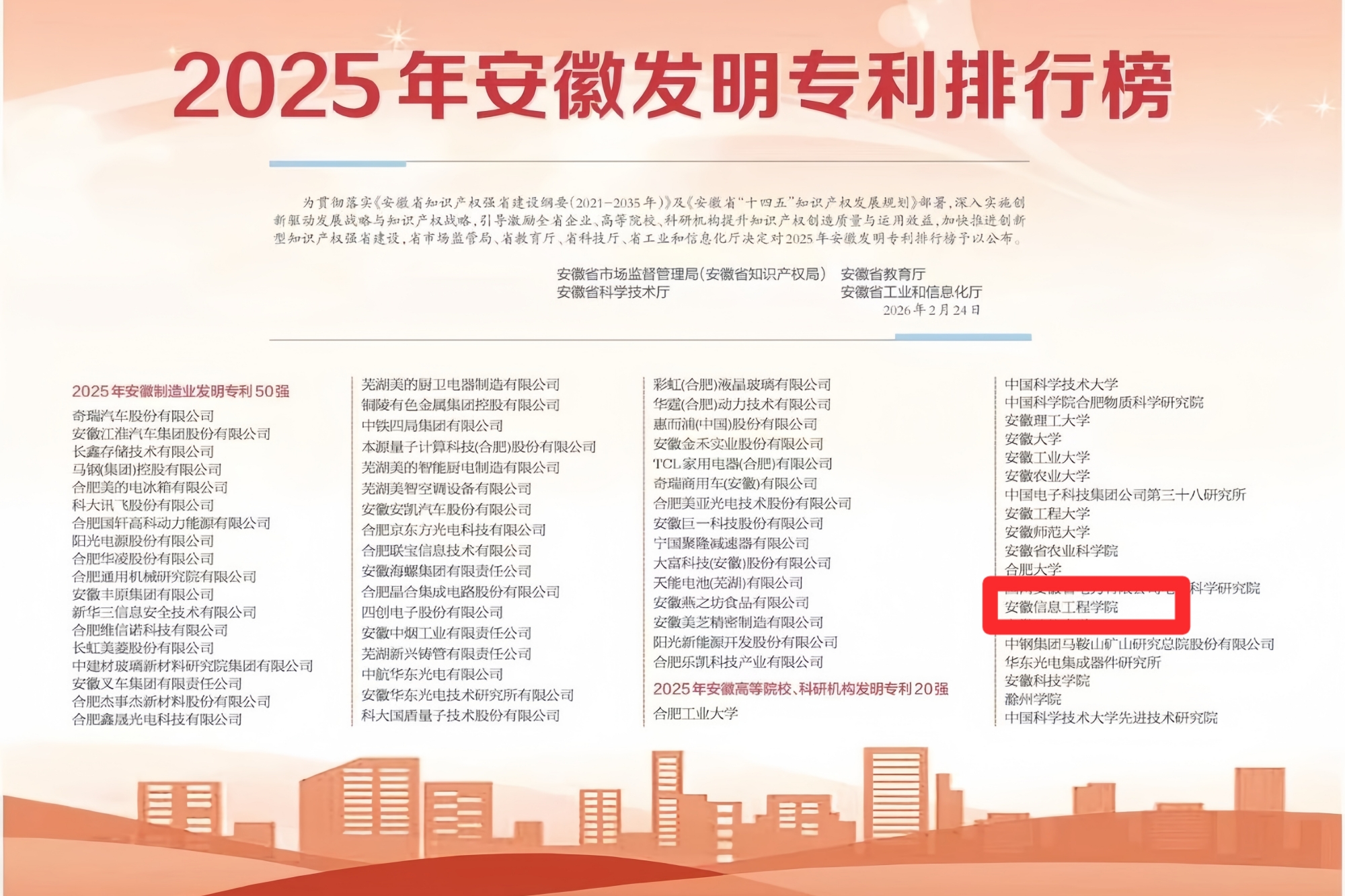 本网讯 近日,安徽省市场监督管理局(安徽省知识产权局)、安徽省教育厅、安徽省科学技术厅、安徽省工业和信息化厅联合发布了“2025年安徽发明专利排行榜”,我校位列“高等院校、科研机构发明专利20强”第12位,连续六年榜上有名,充分彰显了学校在知识产权创造与科技创新领域的持续积淀和稳步提升。(2025年安徽发明专利排行榜)近年来,学校始终坚持应用型办学定位,不断深化教育教学改革,系统推进科研创新体系建设,主动对接国家创新驱动发展战略,持续加大科研投入,优化科研管理机制,有效激发师生创新活力,推动知识产权工作实现量质齐升,截至2025年底,累计授权专利3084件。在成果推广方面,学校连续三年组织选送优秀发明专利项目参加德国纽伦堡国际发明展,累计荣获金奖2项、银奖1项、铜奖1项,国际影响力初步显现。知识产权相关成果多次入选安徽省知识产权公共服务十大典型案例。另外,学校充分发挥国家级技术与创新支持中心(TISC)的平台优势,积极开展知识产权普及宣传与专业信息服务,累计举办知识产权培训、讲座等宣传推
