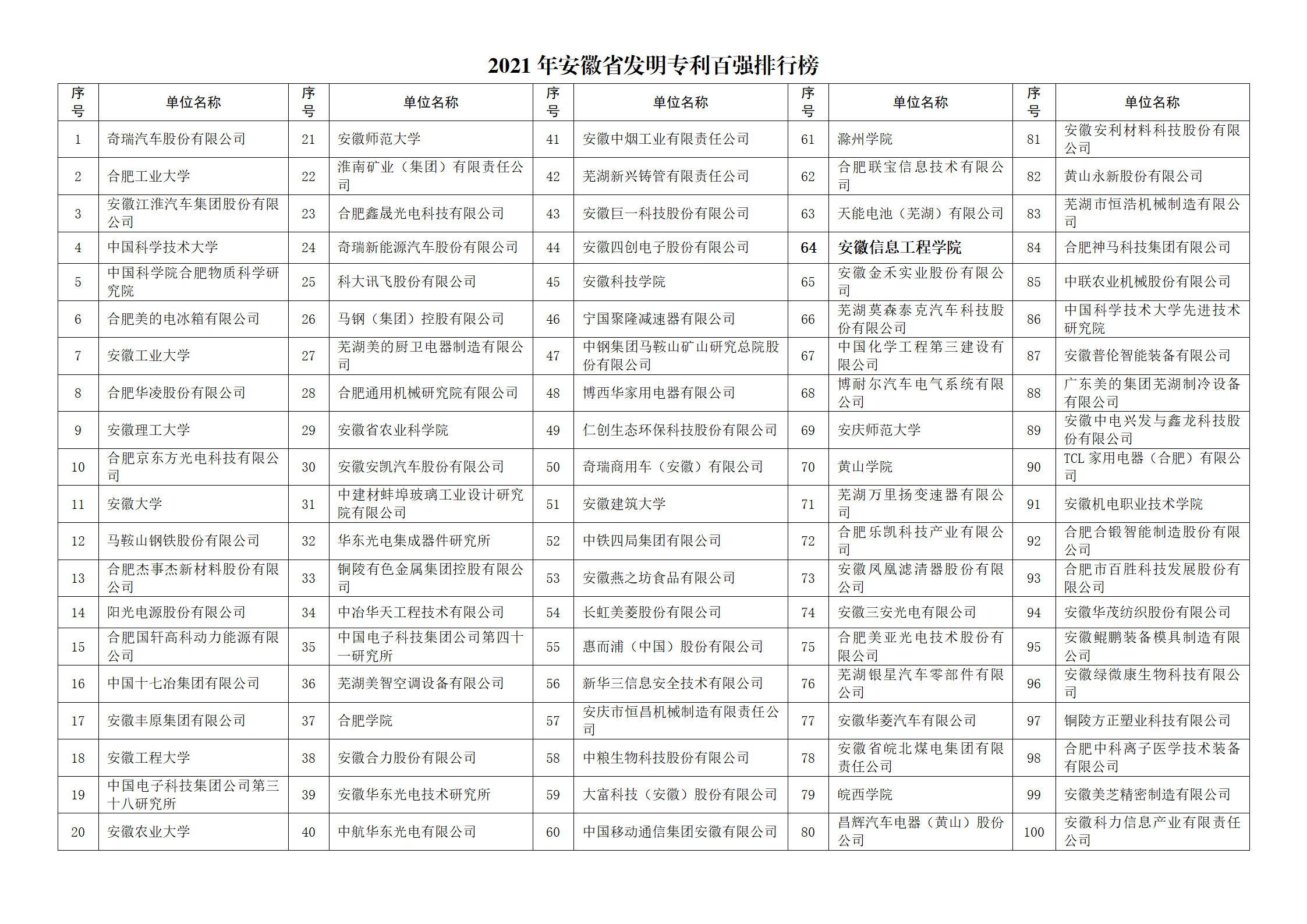 近日,安徽省市场监督管理局(安徽省知识产权局)、安徽省教育厅、安徽省经济和信息化厅联合公布了“2021年安徽省发明专利百强排行榜”,我校再次进入该榜单,从第95位跃升至第64位。2021年我校有效发明专利累计达到187件,较上届增加59.83%。百强榜中企业76家,高校17家,科研机构7家。2022年元月,安徽省人民政府办公厅印发了《安徽省“十四五”知识产权发展规划》,规划中提到“高校”18次,高校是知识产权发展不可或缺的重要阵地。《规划》明确了六方面重点任务,其中和“高校”息息相关的有:——知识产权创造质量显著提高。各类市场主体创新创造能力显著增强,企业、高校院所高价值知识产权协同创造更有效率,知识产权管理政策、制度和机制保障更加完善,全省高价值知识产权拥有量大幅增长。——知识产权人文环境显著优化。知识产权学科建设进一步拓展,引导高校增设知识产权专业和知识产权课程。知识产权人才培养机制更加健全,知识产权人才选拔、评价、流动、激励政策更加完善。这两方面重点任务也是我校目前正在大力实施推进