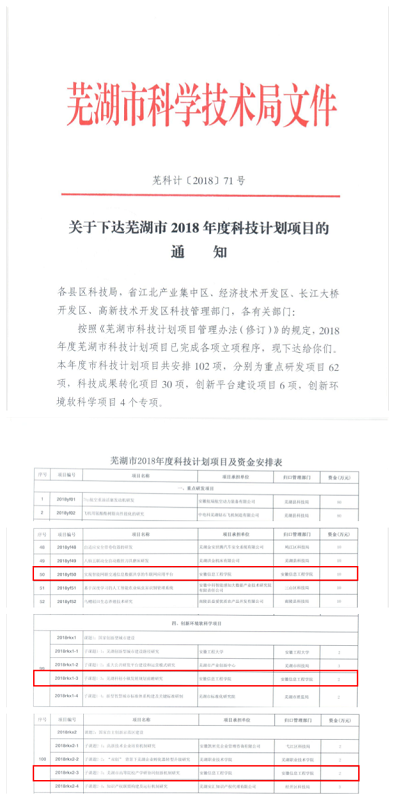 近日,芜湖市科技局下达芜湖市2018年度科技计划项目的通知(芜科计〔2018〕71号)。本年度芜湖市科技计划项目共安排102项,分别为重点研发项目62项,科技成果转化项目30项,创新平台建设项目6项,创新环境软科学项目4大类专项17个子项。我校电气与电子工程学院章敏凤老师主持的“实现智能网联交通信息数据共享的车联网应用平台”(项目编号:2018yf50)获重点研发项目立项,项目资金10万元。另有两个创新环境软科学项目获得立项,分别为艺术设计学院杨小庆老师主持的“芜湖科创小镇发展规划前瞻研究”(项目编号:2018rkx1-3)和管理工程学院钱玉霞老师主持的“芜湖市高等院校产学研协同创新机制研究”(项目编号:2018rkx2-3),项目资金均为2万。我校一直重视科研项目立项实施工作的过程管理,自2015年我校首次获批芜湖市科技计划项目以后,近四年陆续获得18个项目的立项,目前已有7个项目按时通过结题验收,其中有4个项目获得结题验收优秀。为确保立项项目建设工作的顺利进行,科技处要求项目所在的二